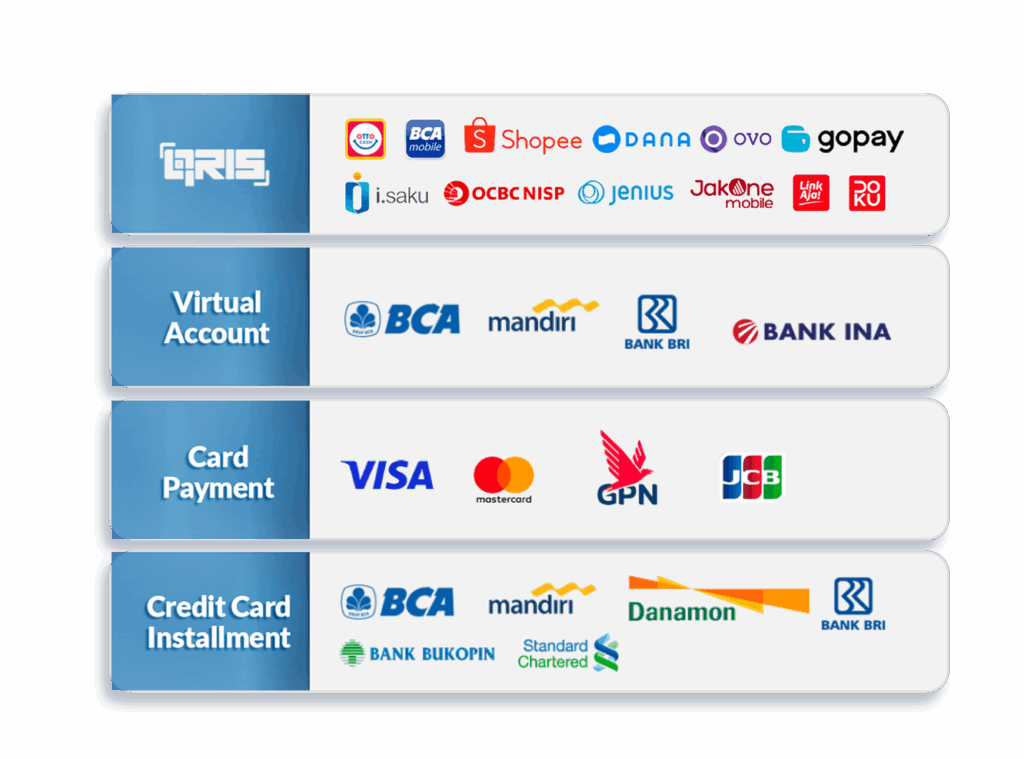 Terima pembayaran dari pelanggan menggunakan kartu debit atau kartu kredit secara online dengan proses yang cepat, aman, dan sesuai regulasi Bank Indonesia.